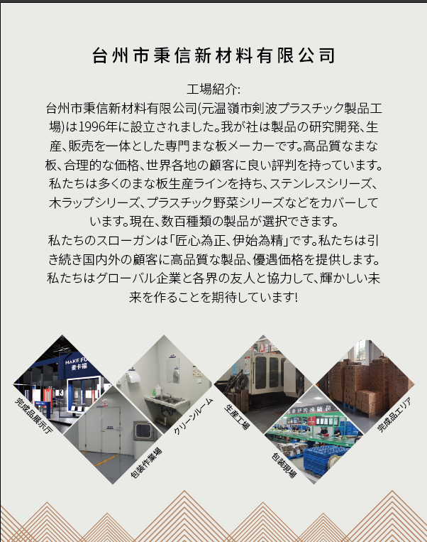 Since its establishment in 1996, it has been specializing in the research and development and manufacturing of kitchen chopping boards. In the field of plastic cutting board production, we always lead the industry with our rich experience and innovative spirit. As a pioneer in antimicrobial cutting boards, we hold 20 design patents to ensure that our products are always at the forefront of functionality and innovation, aiming to meet the increasingly diverse needs of consumers.